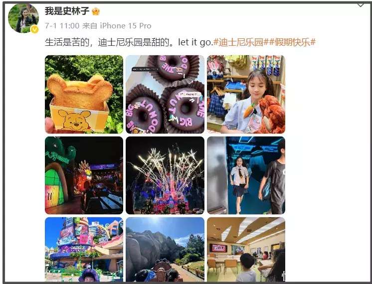 唯有一条7月份发布的动态,史林子隐约流露出一丝情绪,她带着孩子去了迪士尼,感慨“生活是苦的,迪士尼乐园是甜的,let it go”。