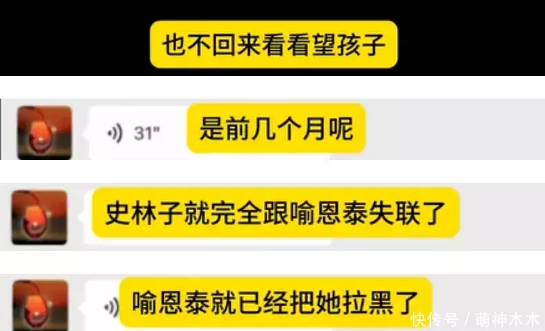 就在几个月前,史林子被喻恩泰拉黑,双方失联了,喻恩泰连孩子都不探望了。